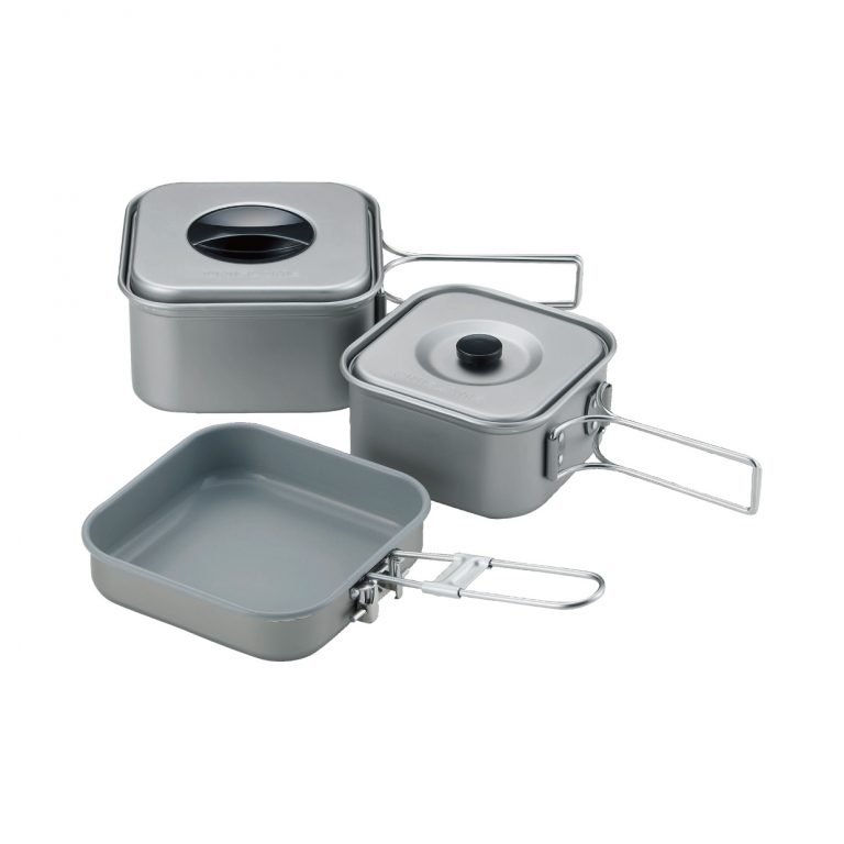 ชุดหม้อและกระทะ ทรงสี่เหลี่ยม ทำจากอลูมิเนียม น้ำหนักเบาทนทาน สามารถเก็บวางซ้อนกันเป็นชุดเดียวได้พกพาสะดวก ขนาดใช้งาน 1-2คน
