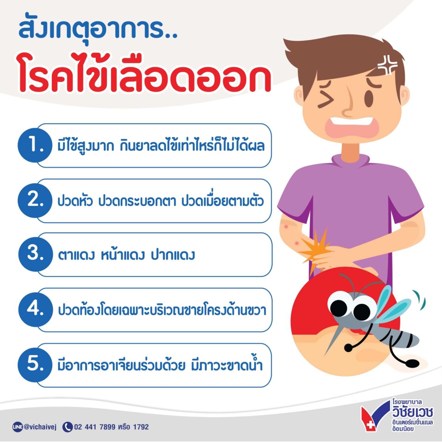 โรคไข้เลือดออกมียุงลายเป็นพาหะ ซึ่งเป็นยุงที่มีการออกหากินในเวลากลางวัน และปัจจุบันมีการพบยุงลายออกหากินในเวลาโพล้เพล้อยู่บ้าง ผู้ป่วยจะมีอาการเหล่านี้หลังได้รับเชื้อจากยุงลาย 5-8 วัน ได้แก่ ไข้สูง คลื่นไส้ อาเจียน ปวดเมื่อย มีจุดเลือดเล็ก ๆ ขึ้นตามแขน ขา ลำตัว ควรไปพบแพทย์ทันทีหากสงสัยว่าจะเป็นไข้เลือดออก และให้งดกินยาแอสไพริน(Aspirin) หรือยาแก้อักเสบชนิด NSAIDs