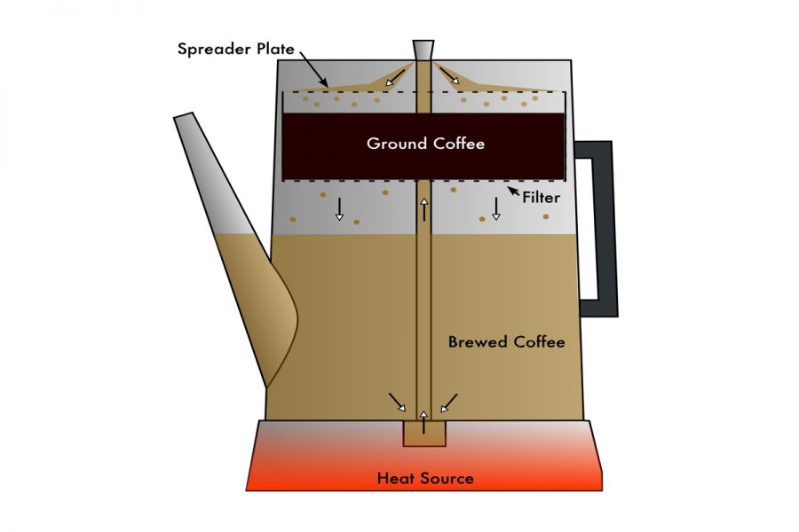 “Percolator” เป็นหมอต้มที่ใช้หลักการสกัดกาแฟแบบแรงดันไอน้ำ เมื่อต้มน้ำในหม้อจนเดือด น้ำร้อนจะดันสูงขึ้นแล้วไหลไปตามท่อแกนกลางขึ้นสู่ด้านบนที่เป็นตะแกรงกรองหรือฟิลเตอร์ข้างในบรรจุกาแฟคั่วบด เมื่อน้ำร้อนพุ่งผ่านผงกาแฟในฟิลเตอร์แล้วจะตกผ่านฟิลเตอร์ลงสู่หม้อด้านล่างอีกครั้ง หมุนวนเวียนอย่างนี้จนกว่าจะยกหม้อต้มลงจากเตาไฟ ใช้เวลาและความร้อนเป็นตัวควบคุมความ “เข้มข้น” ดังนั้น กาแฟจะ “เข้มมาก” หรือ “เข้มน้อย” ก็อยู่ที่รอบของน้ำกาแฟที่หมุนเวียนนี่แหละ