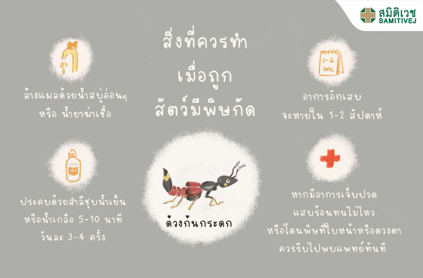 ✅ ล้างแผลด้วยน้ำสะอาดและสบู่ ไม่ควรใช้เหล้า ยาสีฟัน หรือสมุนไพรใดๆ ล้างหรือประคบ