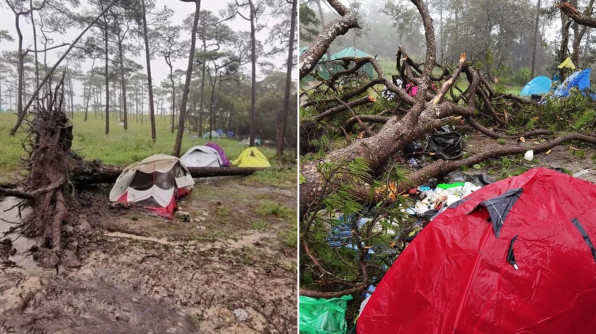 เป็นข้อระมัดระวังโดยเฉพาะเวลาฝนตกกิ่งไม้อาจหัก ฟ้าผ่าต้นไม้ หรือต้นไม้อาจโค่นลงมาทับเต็นท์ได้