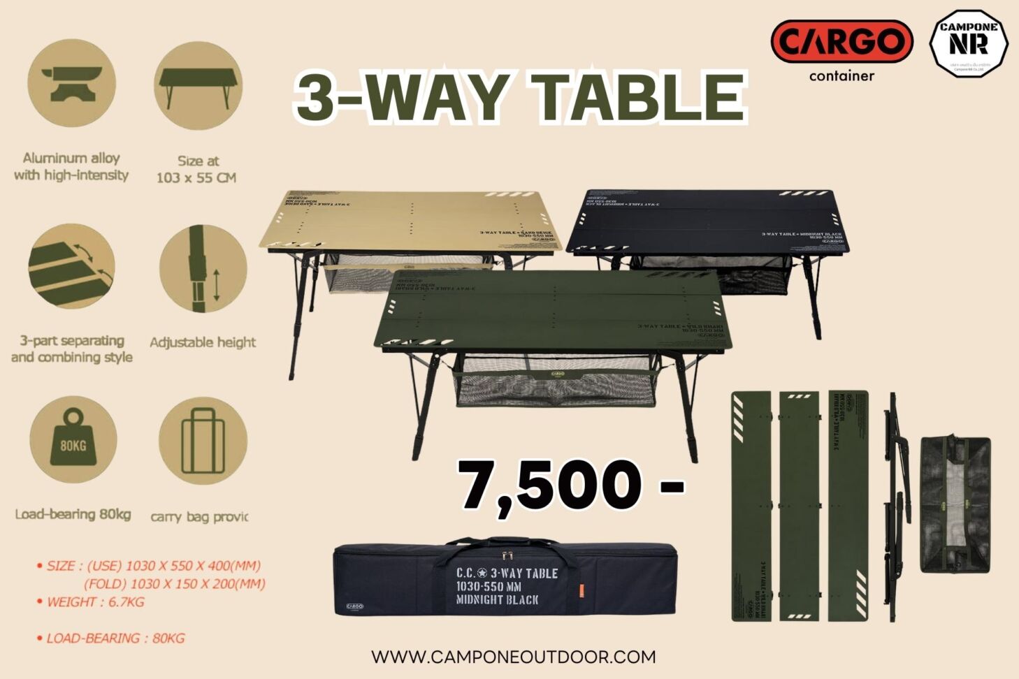 3 Way Table โต๊ะแคมป์ปิ้งขนาดใหญ่ ที่รองรับได้หลายคน สามารถใช้เป็นโต๊ะทานอาหารหรืออื่น ๆ ตามต้องการ ข้อต่อยึดแน่น แข็งแรงทนทาน เคลื่อนย้ายได้อย่างปลอดภัยเมื่อยกโต๊ะ รับน้ำหนักได้ถึง 80 กิโลกรัม ขาโต๊ะทั้งสี่ออกแบบมาให้ปรับได้เอง สามารถปรับระดับและใช้งานได้แม้ในที่ที่พื้นไม่สมดุล และยังปรับระดับความสูงต่ำได้ตั้งแต่ 40 – 58 ซม. ตัวโต๊ะสามารถพับเก็บได้ มาพร้อมกระเป๋าสำหรับจัดเก็บอย่างดี