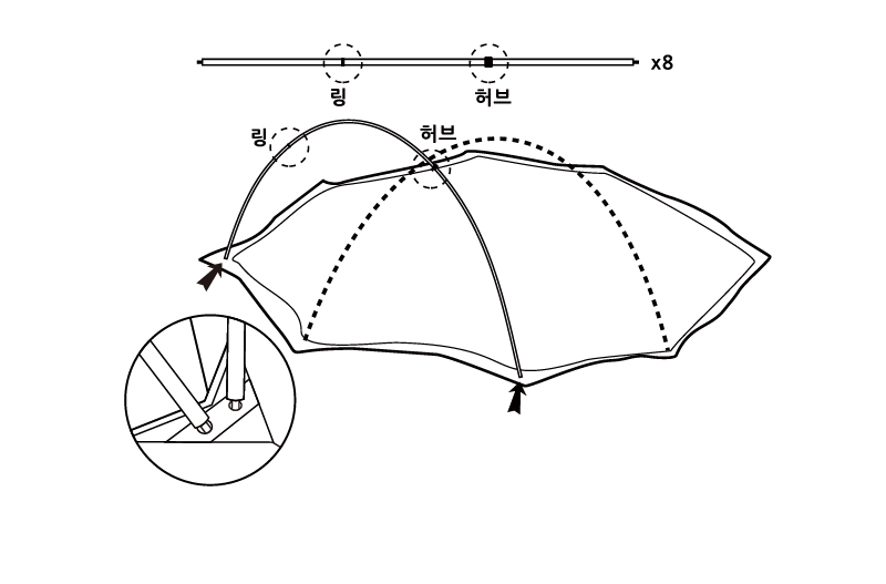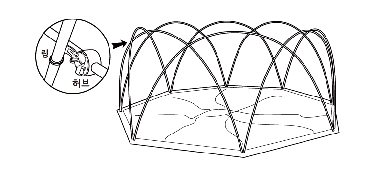 2. สอดปลายทั้งสองข้างของเสาด้านข้างเข้าที่มุมล่างของตัวกำบัง ข้ามรูปแปดเหลี่ยมอันใดอันหนึ่งแล้วเชื่อมต่อกัน ติดตั้ง 8 เส้นติดต่อกันโดยให้วงแหวนเสาด้านข้างและดุมหันไปในทิศทางเดียว