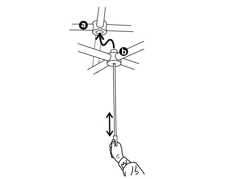 11. จับที่จับของเชือกที่ห้อยจากเสากลาง b ดึงลงแล้วเลื่อนไปทางซ้ายและขวาเพื่อจัดกึ่งกลางของเสา A และเสา B
