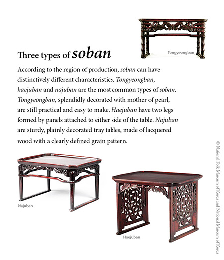 SOBAN แบบดั้งเดิมนั้นเป็นโต๊ะคล้ายถาดเล็ก มักเป็นไม้ ใช้ในประเทศเกาหลีสำหรับใส่อาหารและเป็นโต๊ะรับประทานอาหารแยกกัน โดยทั่วไปจะทำจากไม้วอลนัท ไม้สน หรือแป๊ะก๊วย ซึ่งมักได้มาจากพื้นที่ท้องถิ่นของช่างไม้ งานแกะสลักและภาพจิตรกรรมฝาผนังที่แสดงภาพโซบันถูกพบในสุสานที่มีอายุย้อนไปถึงสมัยอาณาจักรโกกูรยอ นอกจากจะใช้สำหรับการรับประทานอาหารแล้ว โซบังยังใช้สำหรับงานขนของทั่วไป เช่น โต๊ะทำงาน และแท่นบูชาเล็กๆ สำหรับสวดมนต์หรือจุดธูป