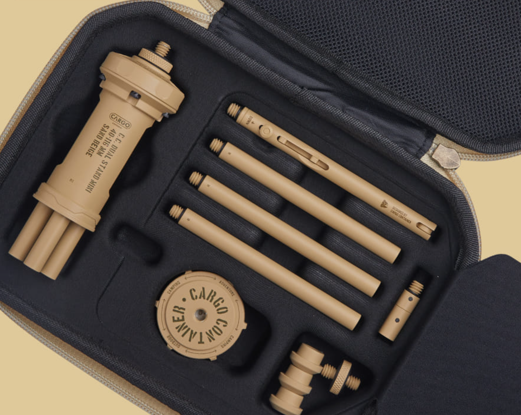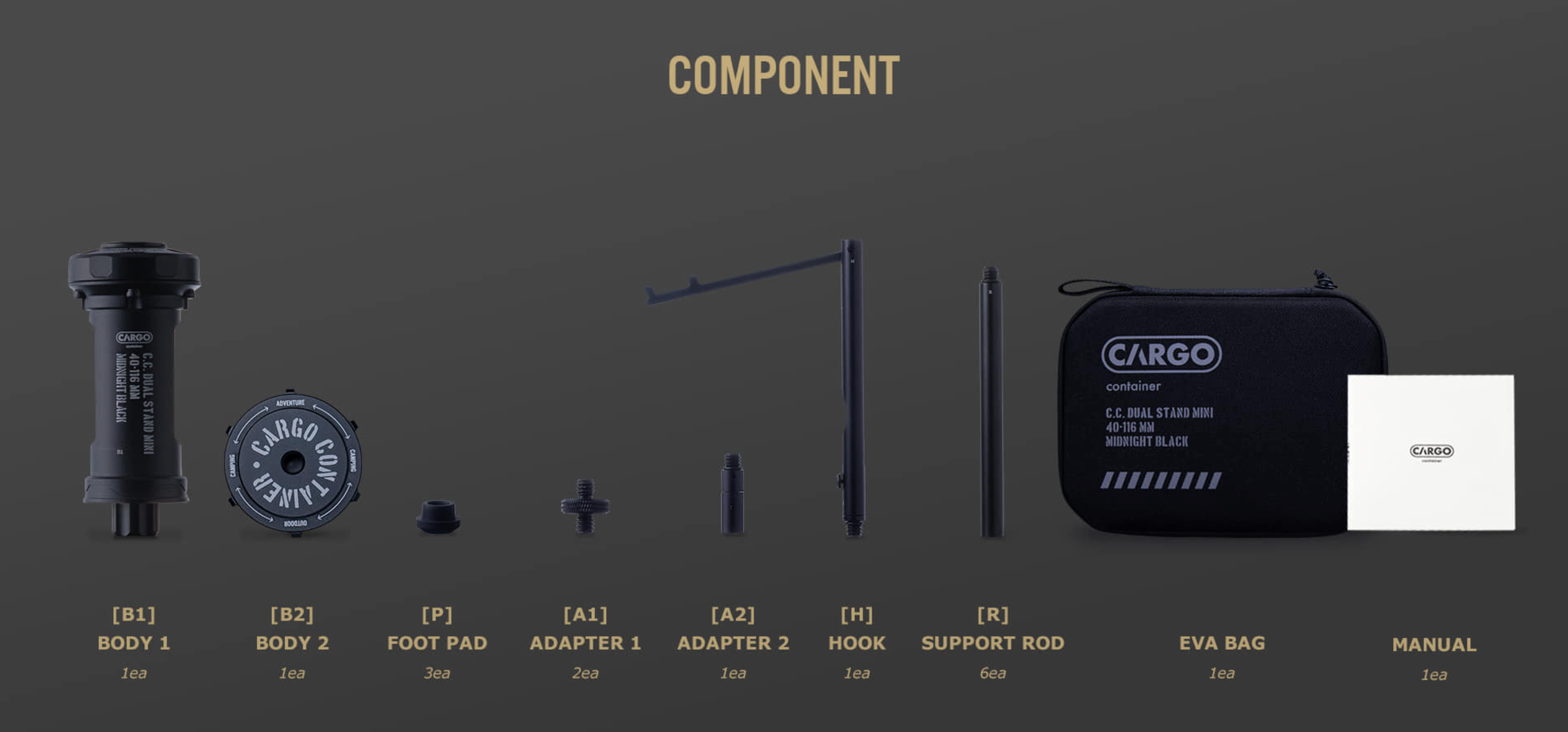 ประกอบด้วยชิ้นส่วนทั้งหมด 15 ชิ้น คุณสามารถประกอบเป็นรูปร่างที่ต้องการได้ขึ้นอยู่กับการใช้งาน มีการฝังตัวถัง 2 ด้านเพื่อยึดวัตถุที่เป็นชิ้นๆ เช่น โต๊ะ เก้าอี้ หรือต้นไม้ไว้อย่างสะดวก นอกจากนี้ยังสามารถประกอบเป็นแท่นวาตะเกียงแบบพกพาได้ และตัว SUPPORT RODs 6 อันสามารถใช้เป็นขาตั้งสามขาหรือปรับความสูงได้