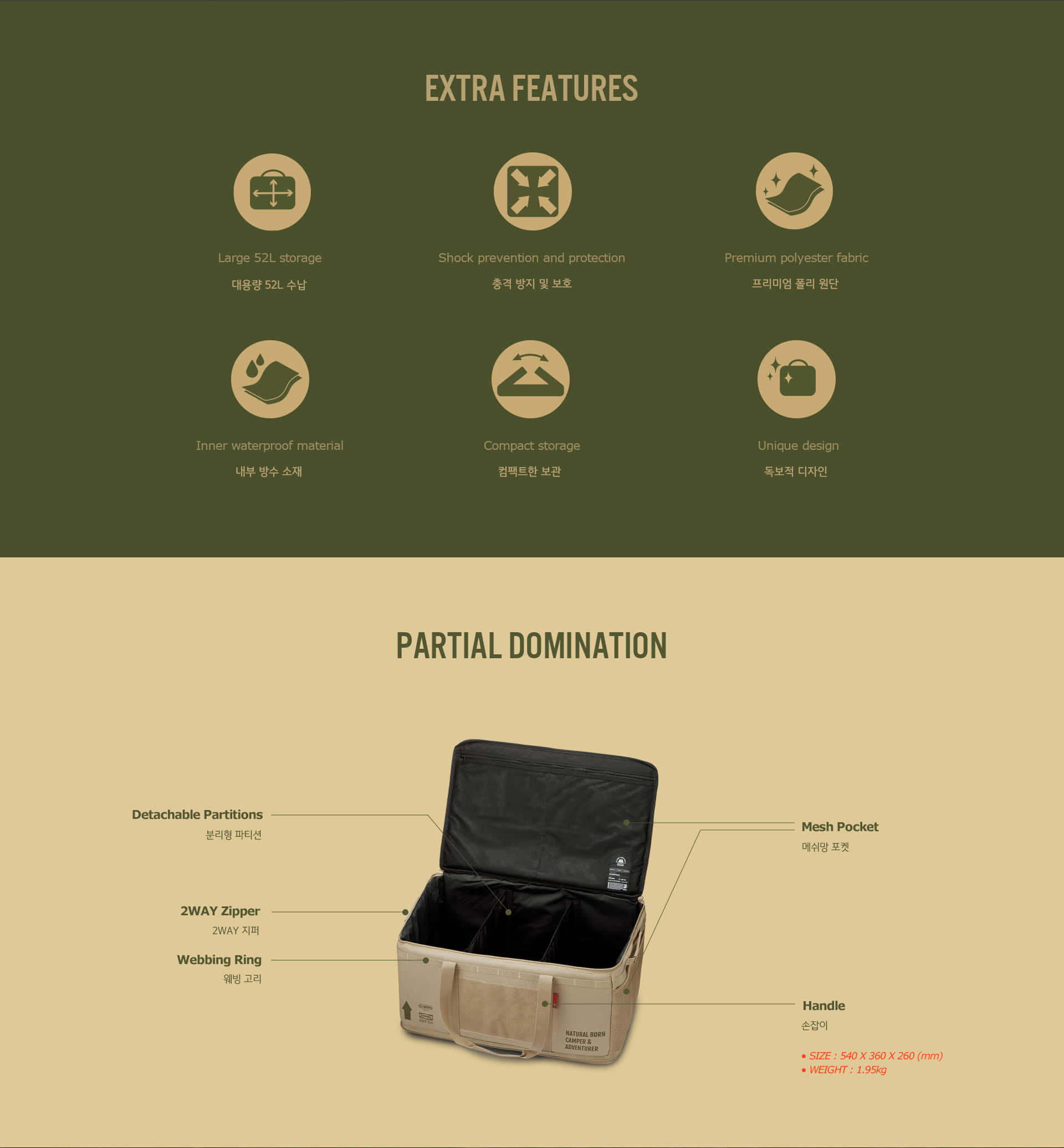 รายละเอียด : Cargo Container Custom Bag Large เป็นกระเป๋าเก็บของขนาด 52L ที่ปรับแต่งมาเพื่อจัดเก็บอุปกรณ์ตั้งแคมป์ต่างๆ เช่น ถุงนอน อุปกรณ์ทำอาหาร เก้าอี้ หรือตะเกียง กระเป๋าบุโฟมนุ่มหนา 10 มม. ทุกด้านเพื่อรองรับแรงกระแทกจากภายนอกและปกป้องสิ่งของภายใน นอกจากนี้ยังมีช่องแบ่งด้านใน 2 ช่องแยกกันเพื่อเก็บของเข้าที่ และป้องกันไม่ให้เคลื่อนย้ายไปมาหรือกระแทกกันด้านใน ผ้าด้านนอกเป็นผ้า 900D ที่แข็งแรงและทนทานซึ่งทำจากกระบวนการทอสามขั้นตอนที่ทนทานต่อแรงดึงสูง การสึกหรอและการปนเปื้อนภายนอก และวัสดุด้านในใช้การเคลือบกันน้ำระดับพรีเมียมเพื่อให้อุปกรณ์ปลอดภัยจาก แรงกระแทก ความร้อน ความชื้น ฯลฯ