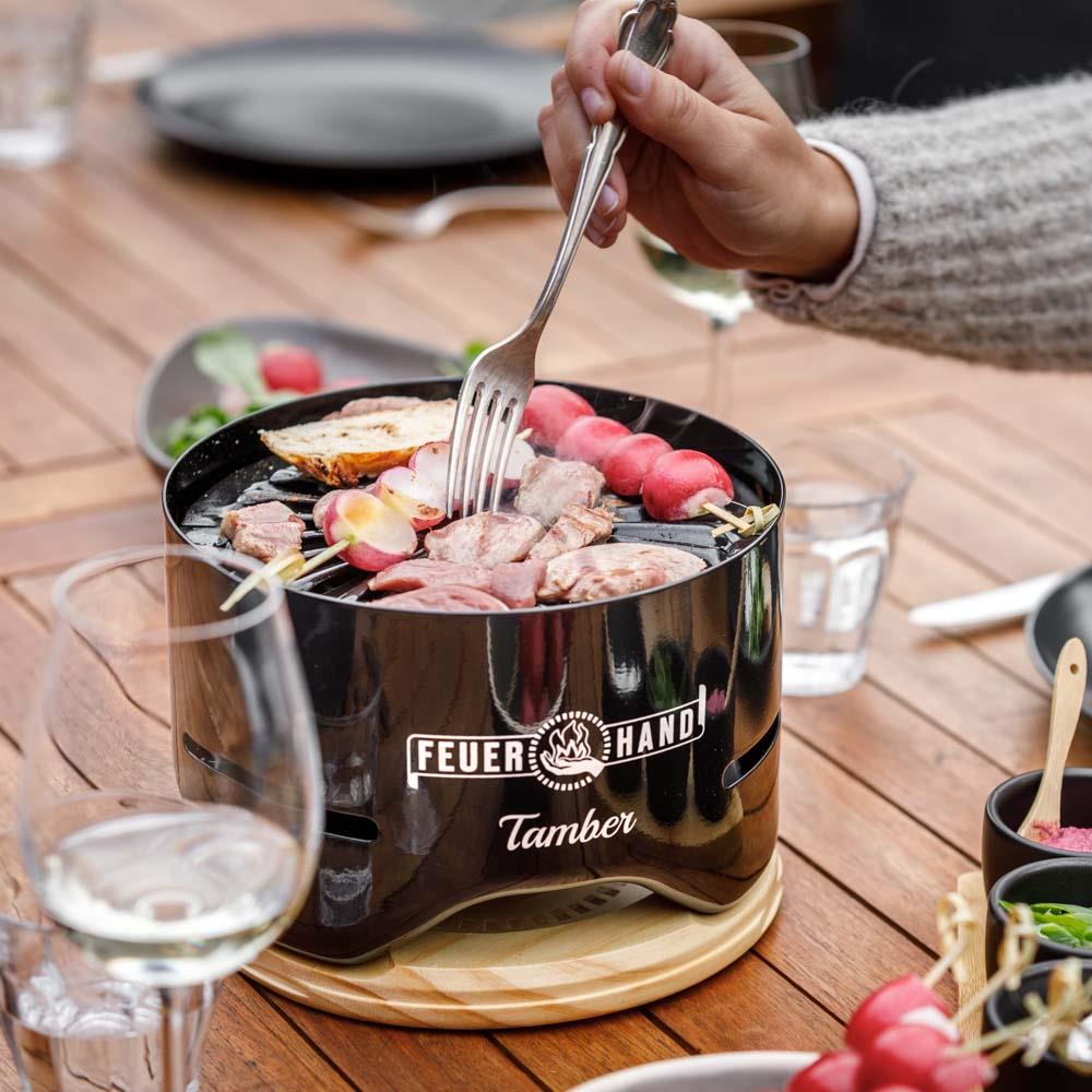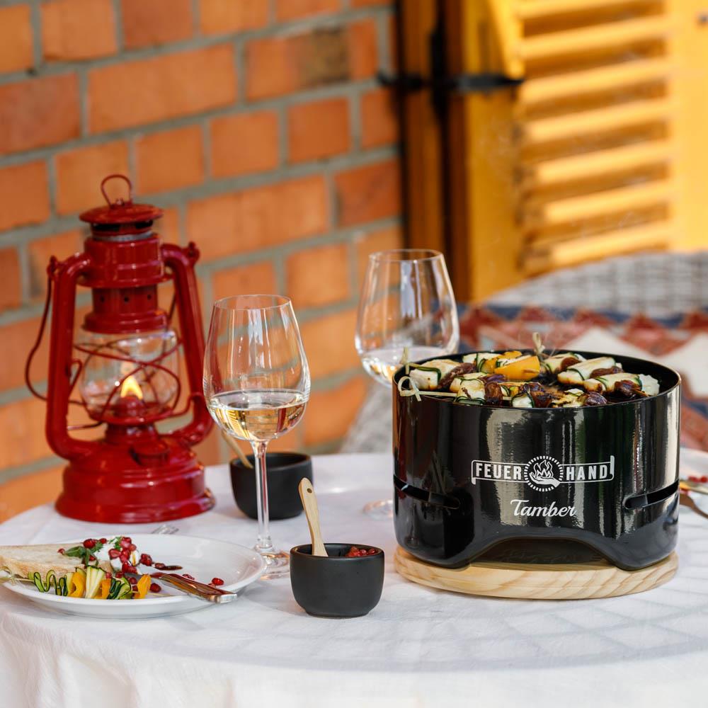 Feuerhand Tamber เตาตั้งโต๊ะไร้ควัน เตาเผาชั้นในฝนัง2ชั้น(Stainless Steel) ใช้หลักการ Secondary combustion ก๊าซเสียจะถูกเผาซ้ำด้วยการป้อนอากาศจุดที่2บริเวณส่วนบนของเตาหลังการเผารอบแรกของถ่านจากด้านล่าง ทำให้ได้ความร้อนเพิ่มและลดควัน