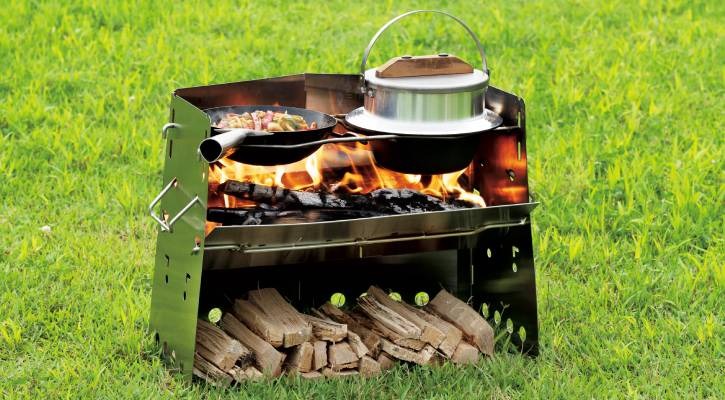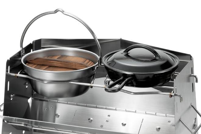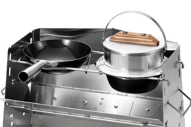 คุณสามารถใส่ตะแกรงไว้เพื่อวางกระทะทอด หรือจะ “ถอดซี่ตะแกรงออก” เพื่อวางหม้อก้นลึก เช่น หม้อหุงข้าวแคมป์ปิ้งหรือกระทะจีนลงไปในช่องไฟโดยตรง ซึ่งจะช่วยให้หม้อได้รับความร้อนจากฟืนได้ดียิ่งขึ้น และมั่นคงกว่าการวางบนตะแกรงธรรมดา
