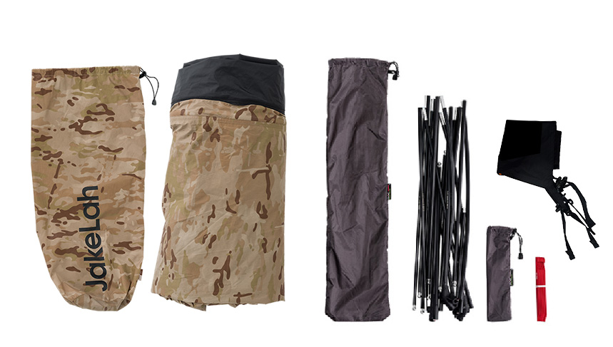 อุปกรณ์ที่ได้รับ : ผ้าเต็นท์ , โครงเต็นท์ , อุปกรณ์เสริม: สมอบก (J. Stake F) x 8, เชือกดึงแรงดึงสูง (2 มม. – 1.6 ม.) x 4 เส้น