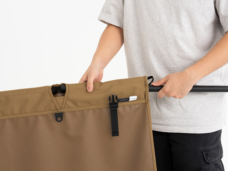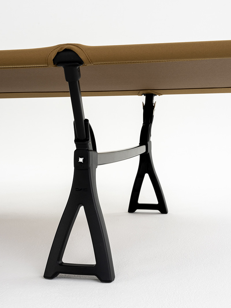 ฐานขากว้างพร้อมวัสดุนุ่มพิเศษ รองรับการวางบนพื้นหญ้า ดิน ทราย หรือแม้แต่พื้นเต็นท์ได้อย่างมั่นคง โดยไม่ทำให้พื้นเสียหายหรือเตียงสั่นไหว ตัวเตียงยังมีการเย็บผ้าเฉพาะทางเพื่อป้องกันไม่ให้ Side Pole หลุดออกจากช่องใส่ แม้มีการพลิกตัวหรือเคลื่อนย้าย
