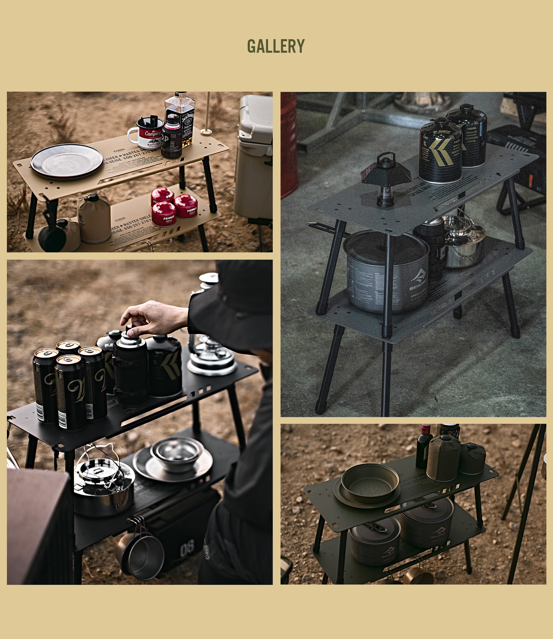 รายละเอียด : โต๊ะ MASTER SHELF TABLE สำหรับชาวแคมป์โดยเฉพาะ ออกแบบมาให้ใช้งานได้หลากหลายตามสไตล์ของผู้ใช้งาน ในชุดประกอบด้วยโต๊ะ 2 ตัว ซึ่งสามารถใช้เป็นชั้นวาง 2 ชั้นเมื่อติดตั้งในแนวตั้ง หรือใช้เป็นโต๊ะรับประทานอาหารแบบเตี้ยเมื่อใช้งานในแนวนอน เราพัฒนาผ้าหุ้มขาโต๊ะของเราเองขึ้นมาเพื่อยึดโต๊ะด้านล่างให้มั่นคงเมื่อใช้เป็นชั้นวาง นอกจากนี้ โต๊ะและขายังทำเป็นชิ้นเดียว ช่วยให้ติดตั้งและถอดชิ้นส่วนได้ง่ายและรวดเร็ว