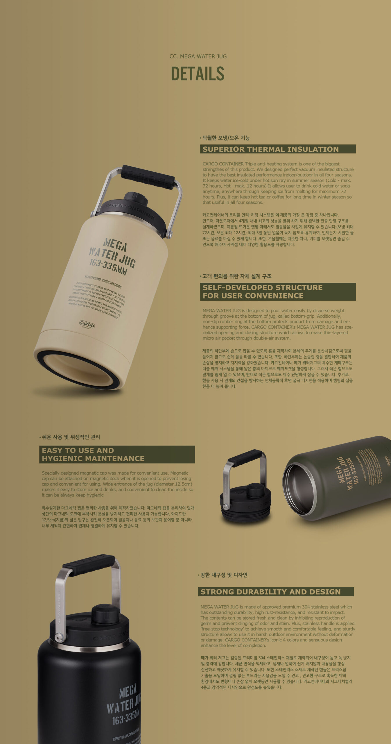 รายละเอียด : เหยือกน้ำระดับพรีเมียมที่พัฒนาโดย CARGO CONTAINER และได้รับการจดสิทธิบัตร ด้านล่างมีที่จับที่เป็นเอกลักษณ์เฉพาะได้รับการออกแบบเพื่อให้ทุกคนสามารถใช้งานได้ง่าย โครงสร้างฉนวนความร้อนอย่างดี ทำจากสแตนเลสสตีลคุณภาพดีที่สุด และระบบกักเก็บความร้อน-เย็น แบบ Triple Anti-heating ที่ออกแบบเป็นพิเศษ (เย็น – สูงสุด 72 ชั่วโมง ร้อน – สูงสุด 12 ชั่วโมง)