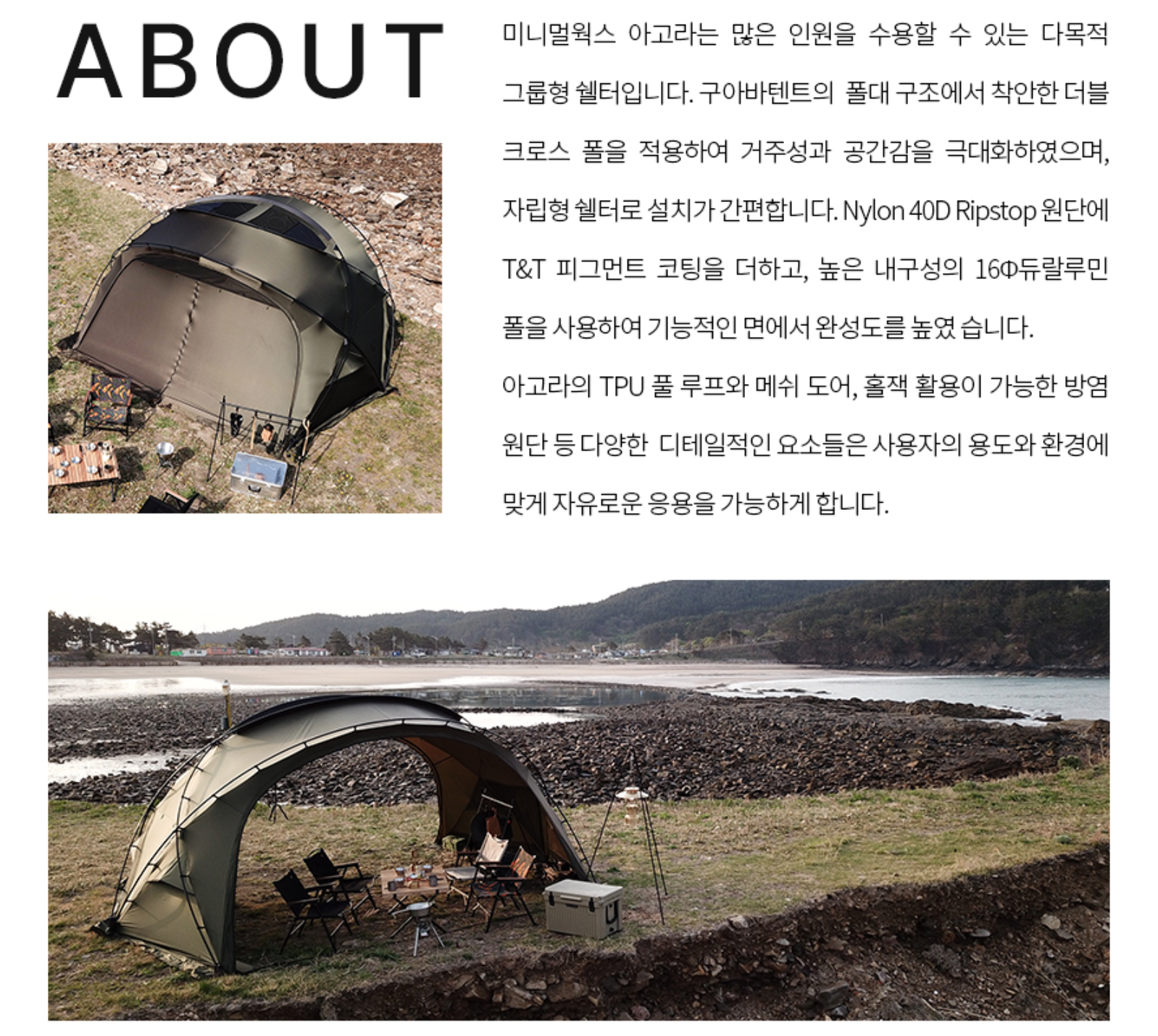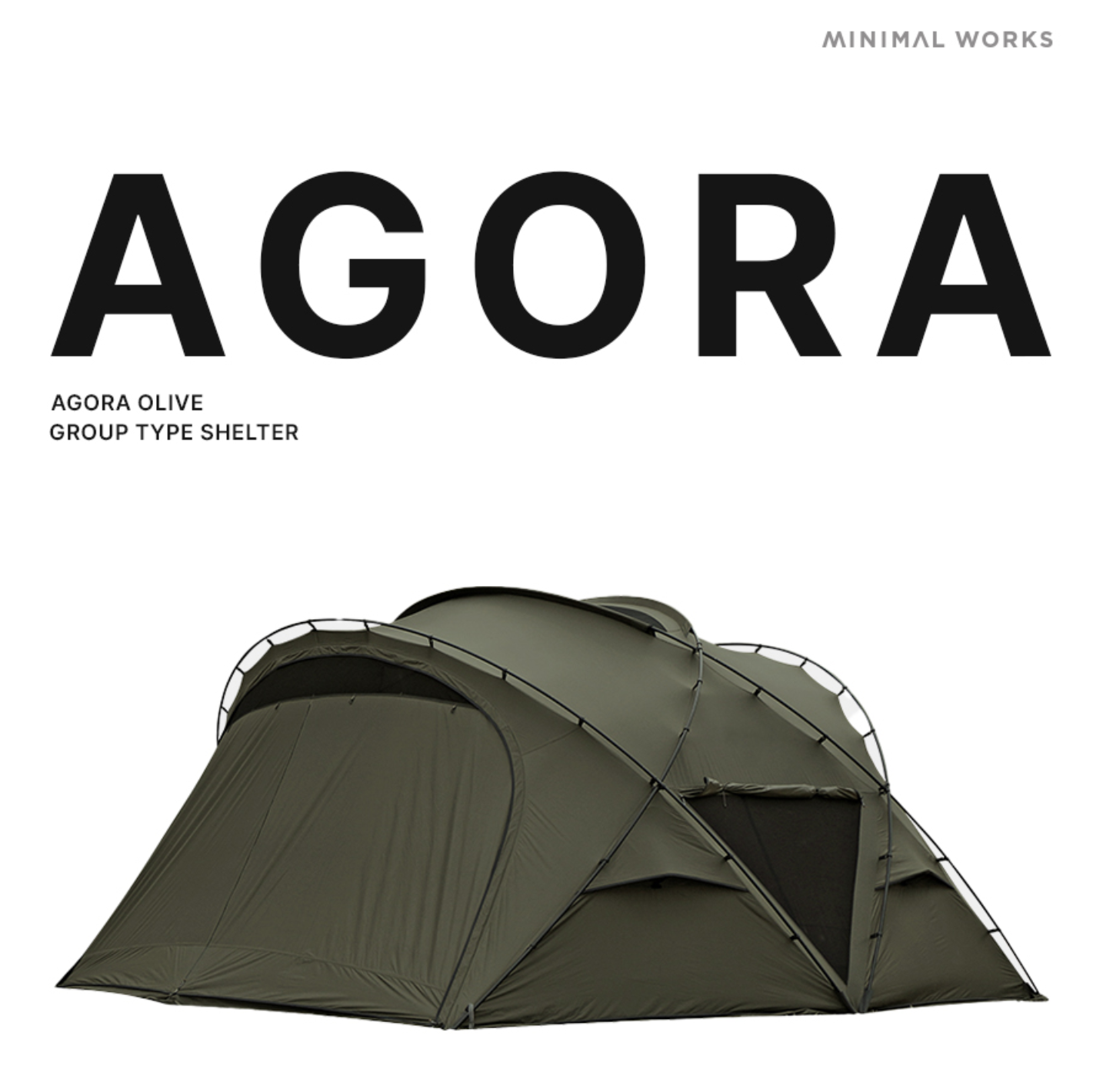Minimal Works Agora เป็น Shelter เอนกประสงค์ที่สามารถรองรับได้หลายคนในสภาพแวดล้อมต่างๆ สามารถใช้ได้กับทุกสภาพอากาศในเมืองไทย โดยเฉพาะฤดูฝนและฤดูหนาว โครง Shelter ที่เป็นซิกเนเจอร์ของ Minimal Works ใช้โครงสร้างเสาไขว้คู่ พื้นที่เปิดกว้าง ประตูกว้างที่สมมาตรทั้งสองด้านให้ความรู้สึกที่เย็นสบาย กว้างขวาง เสาโครง ใช้วัสดุ Duralumin ที่แข็งแรง น้ำหนักเบา และยังมีอุปกรณ์เสริม เช่นประตู TPU ประตูตาข่าย ซึ่งเป็นอุปกรณ์เสริมสำหรับ Agora จำหน่ายแยก สามารถถอดออกได้อย่างง่ายดาย