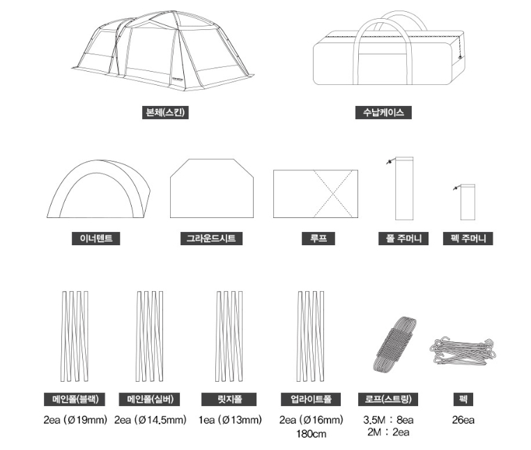 – โครงเต้นท์ 5 ชุด, เสาเต้นท์ 2 ชุด, เชือก 10 เส้น, สมอบก 26 อัน