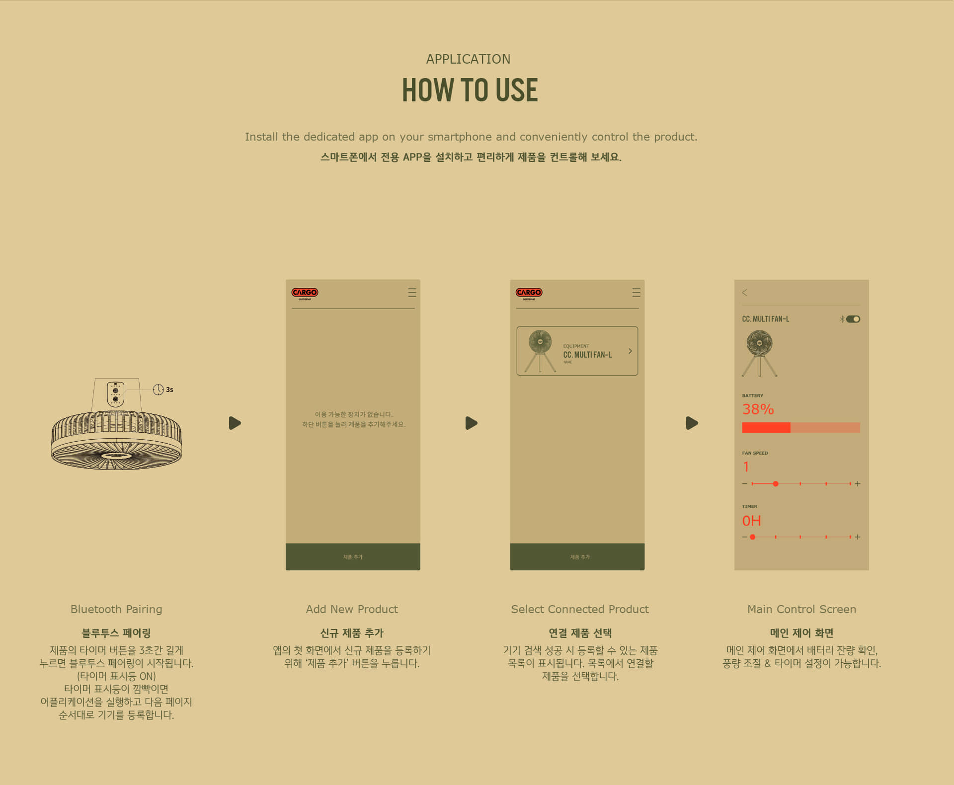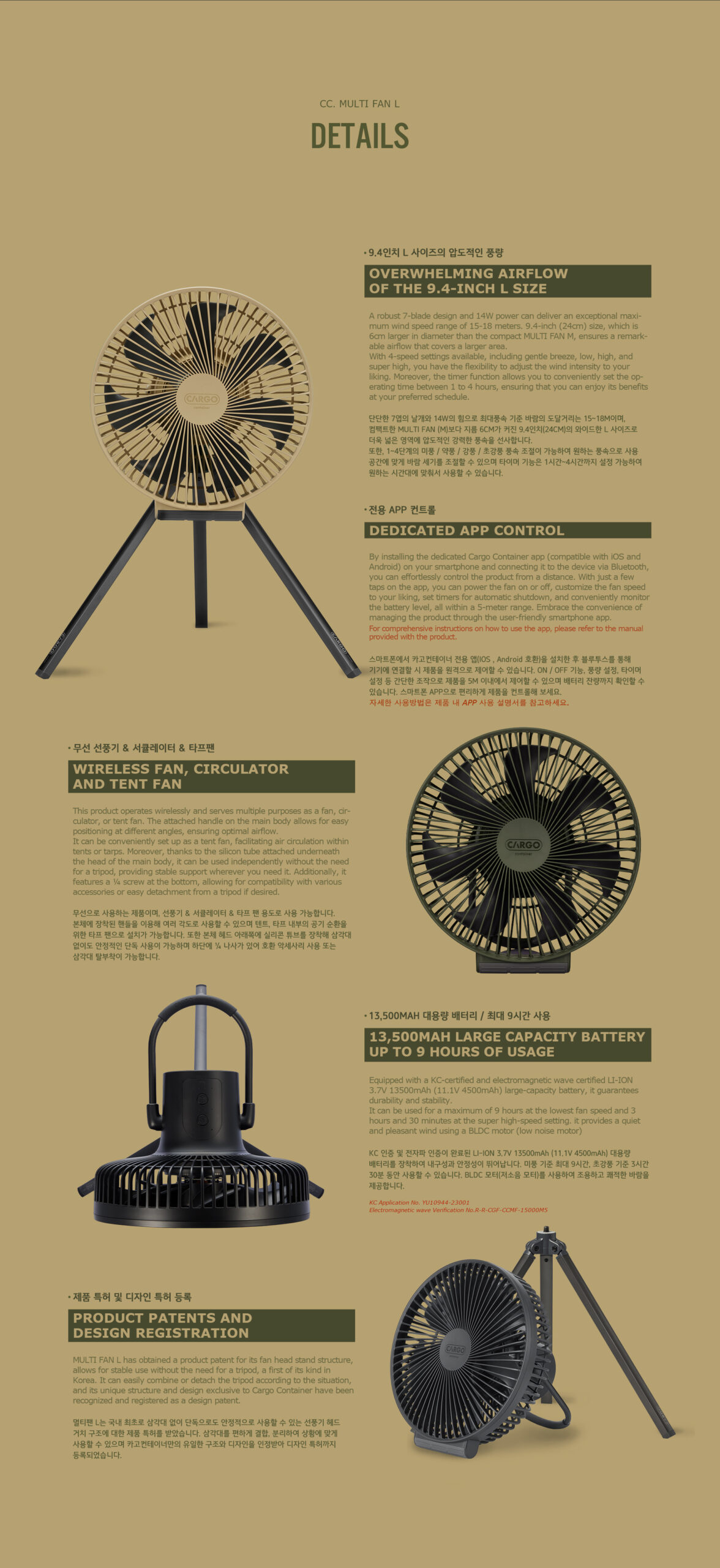 รายละเอียด : MULTI FAN L พัดลมไร้สายรุ่นใหม่แบรนด์ Cargo container จากประเทศเกาหลี พัดลม Multi fan L ให้การไหลเวียนของอากาศได้ดีขึ้นกว่าเดิม ด้วยการออกแบบใบพัดมากถึง 7 ใบ และขนาดที่กว้างถึง 9.4 นิ้ว (24 ซม.) นอกจากนี้ ความพิเศษของรุ่น Multi fan L ยังสามารถใช้งานได้อย่างง่ายดาย สามารถควบคุมการเปิด-ปิด ตั้งเวลา ผ่านแอปในสมาร์ทโฟนได้อีกด้วย Multi fan L มาพร้อมแบตเตอรี่ความจุสูง LI-ION 3.7V 13500mAh (11.1V 4500mAh) ที่ผ่านการรับรองโดย KC และคลื่นแม่เหล็กไฟฟ้า รับประกันความทนทานและความเสถียร ใช้งานได้สูงสุด 9 ชั่วโมงที่ความเร็วพัดลมต่ำสุด และ 3 ชั่วโมง 30 นาทีที่การตั้งค่าความเร็วสูงพิเศษ ให้ลมที่เงียบและสบายด้วยมอเตอร์ BLDC (มอเตอร์เสียงเบา)