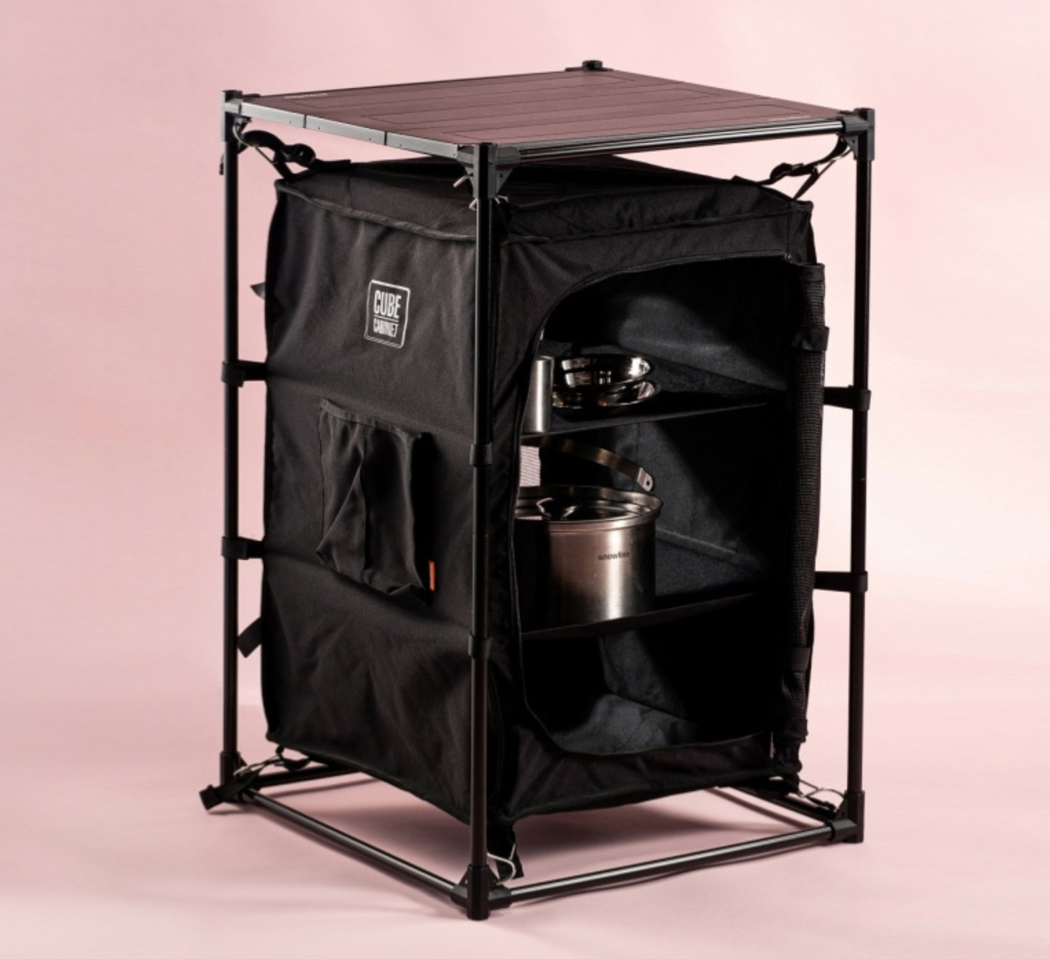 ชั้นวางอุปกรณ์ทำอาหารพับเก็บได้ มีประตูเปิดปิดกันแมลง ผ้าใบกันน้ำ น้ำหนักเบาพกพาสะดวก เป็นโต๊ะในตัวและยังมีช่องใส่กระติกน้ำอีกด้วย รับน้ำหนักได้ 15 กิโลกรัม