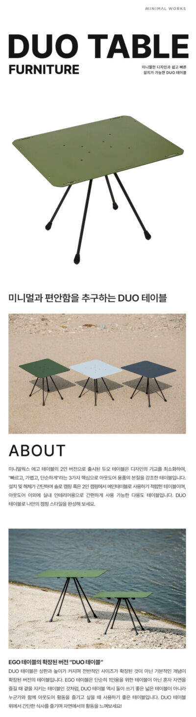 รายละเอียด : Minimal Works table duo เป็นโต๊ะสำหรับสองคน โดยลดเทคนิคการออกแบบลง และเน้นย้ำถึงแก่นแท้ของอุปกรณ์กลางแจ้งด้วยสามหลักการ “รวดเร็ว เบา และเรียบง่าย”