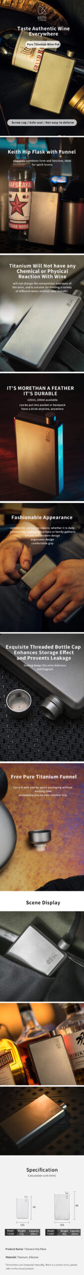 รายละเอียด : ขวดพกพาไทเทเนียม Hip flask รุ่น Ti9306 จาก Keith ขนาด 120ml น้ำหนักเบาเพียง 63 g พร้อมชุดหัวสำหรับเติมลงขวด เหมาะสำหรับคนที่ต้องการพกพาขวดขนาดเล็ก โดยมากมักนิยมใช้ในการบรรจุเครื่องดื่มแอลกอฮอล์ เช่น เหล้า ไวน์ วิสกี้ เป็นต้น
