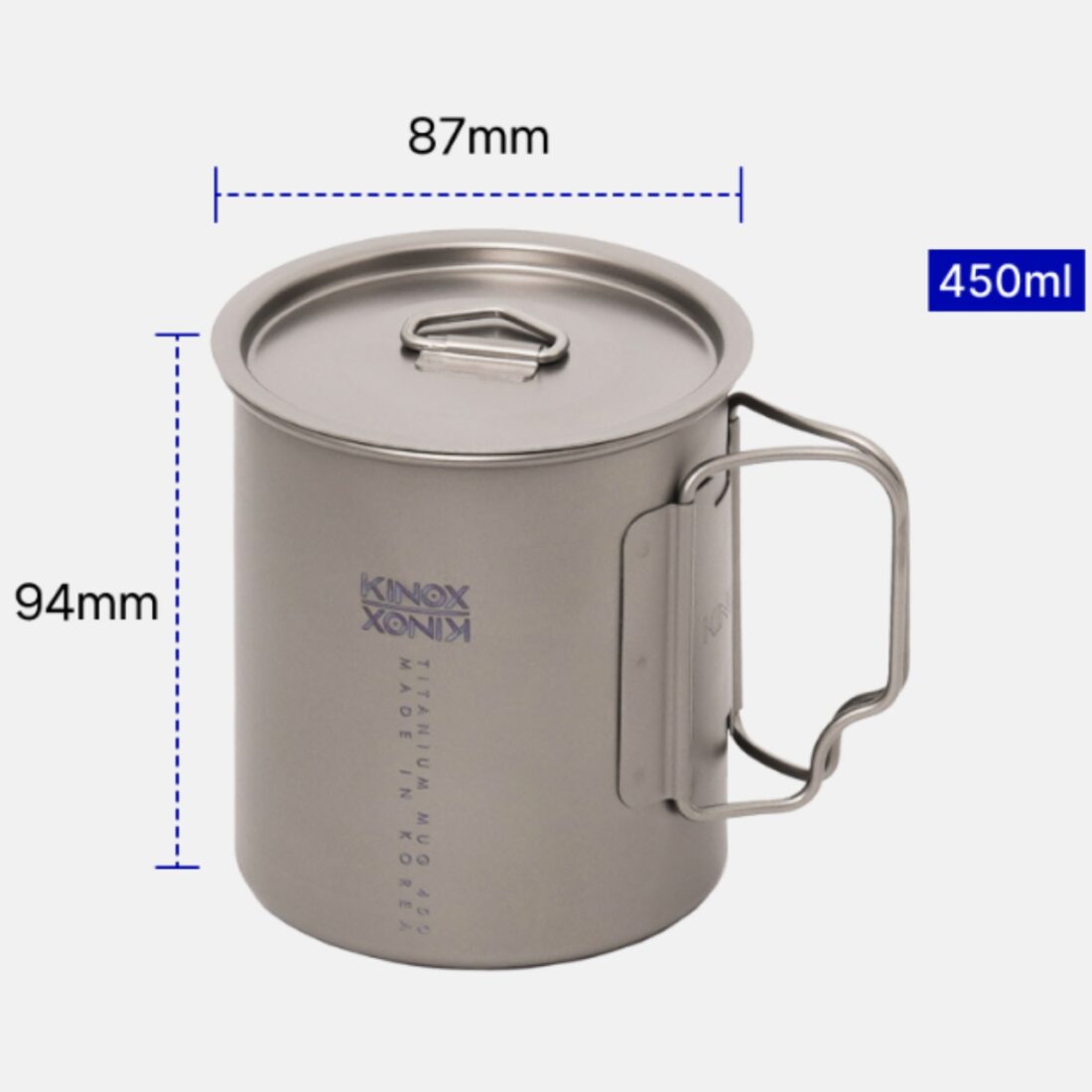 สัมผัสที่สุดของความเบาและความทนทานด้วยแก้วไทเทเนียมจาก KINOX ขนาด 450ml ผลิตจากไทเทเนียมบริสุทธิ์เกรดพรีเมียม (Titanium 99.5%+) ซึ่งเป็นวัสดุเกรดเดียวกับที่ใช้ในวงการแพทย์ ทำให้มั่นใจได้ถึงความปลอดภัยสูงสุด น้ำหนักเบาเป็นพิเศษ แข็งแรงทนทาน และทนต่อการกัดกร่อนได้ดีเยี่ยม มาพร้อมฝาปิดไทเทเนียมที่ช่วยเก็บความร้อนและป้องกันฝุ่นละออง ด้ามจับบนฝาสามารถตั้งขึ้นได้เพื่อความปลอดภัยในการใช้งาน และหูหิ้วของแก้วยังพับเก็บได้เพื่อความสะดวกในการจัดเก็บ