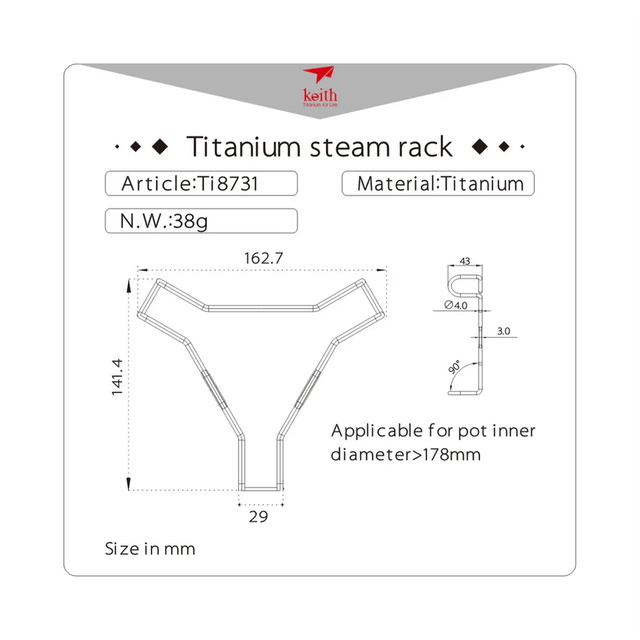 รายละเอียด : ฐานรองนึ่ง รองหม้อ Keith ผลิตจากไทเทเนียม น้ำหนักเบา ใช้วางในหม้อ สำหรับการนึ่ง หรือเป็นฐานวางหม้อสำหรับเตา