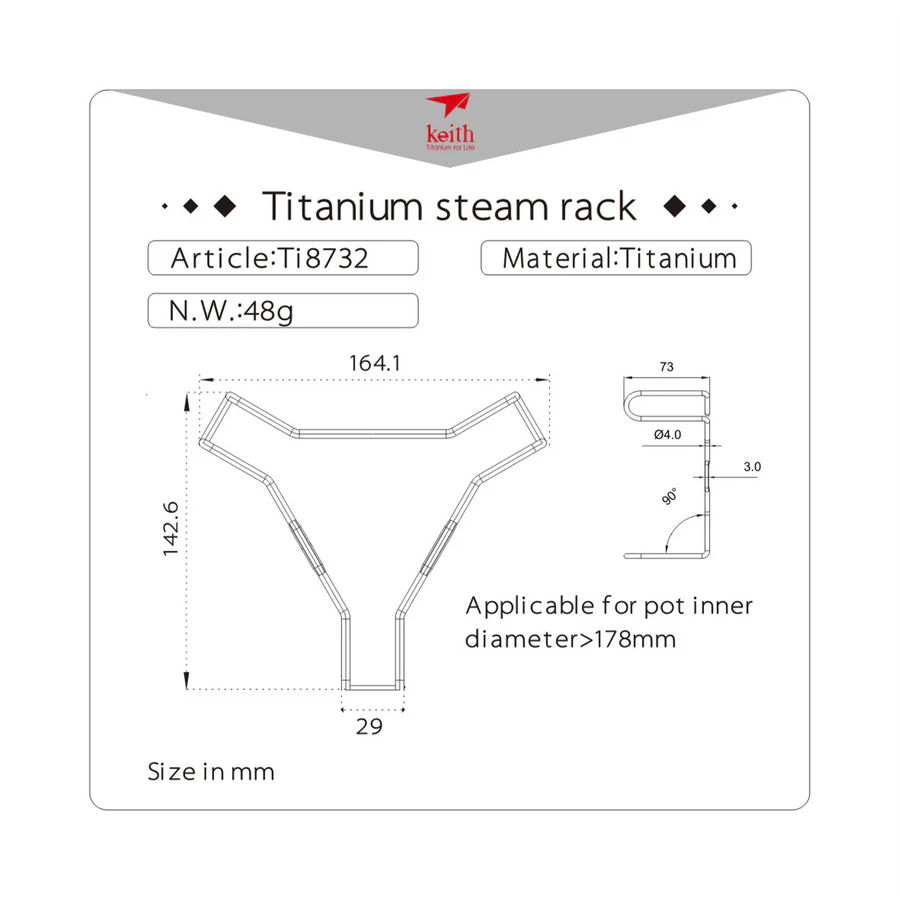 รายละเอียด : ฐานรองนึ่ง รองหม้อ Keith ผลิตจากไทเทเนียม น้ำหนักเบา ใช้วางในหม้อ สำหรับการนึ่ง หรือเป็นฐานวางหม้อสำหรับเตา