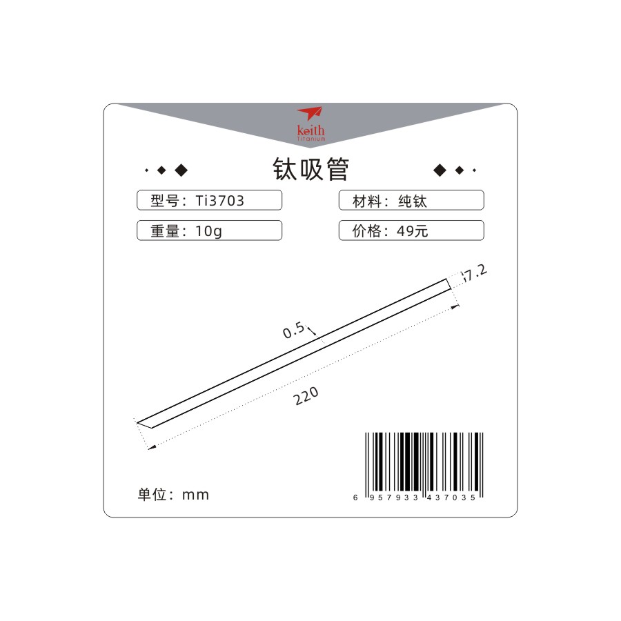 หลอดไทเทเนียมของ Keith รุ่น Ti3703นั้นเป็นหลอดแบบตรง ที่มีน้ำหนักเบาเพียง 10 กรัม แข็งแรงเพราะผลิตจากไทเทเนียมบริสุทธิ์ ปลอดภัยต่อการใช้งาน เพราะไม่เป็นสนิม ทนความร้อนและความเย็นได้สูง อีกทั้ง ไม่รบกวนรสชาติของสิ่งที่คุณดื่มเหมือนพลาสติค ทำให้ ไม่ว่าจะเป็นกาแฟ ชา เบียร์ คุณก็จะได้รสชาติที่แท้จริง