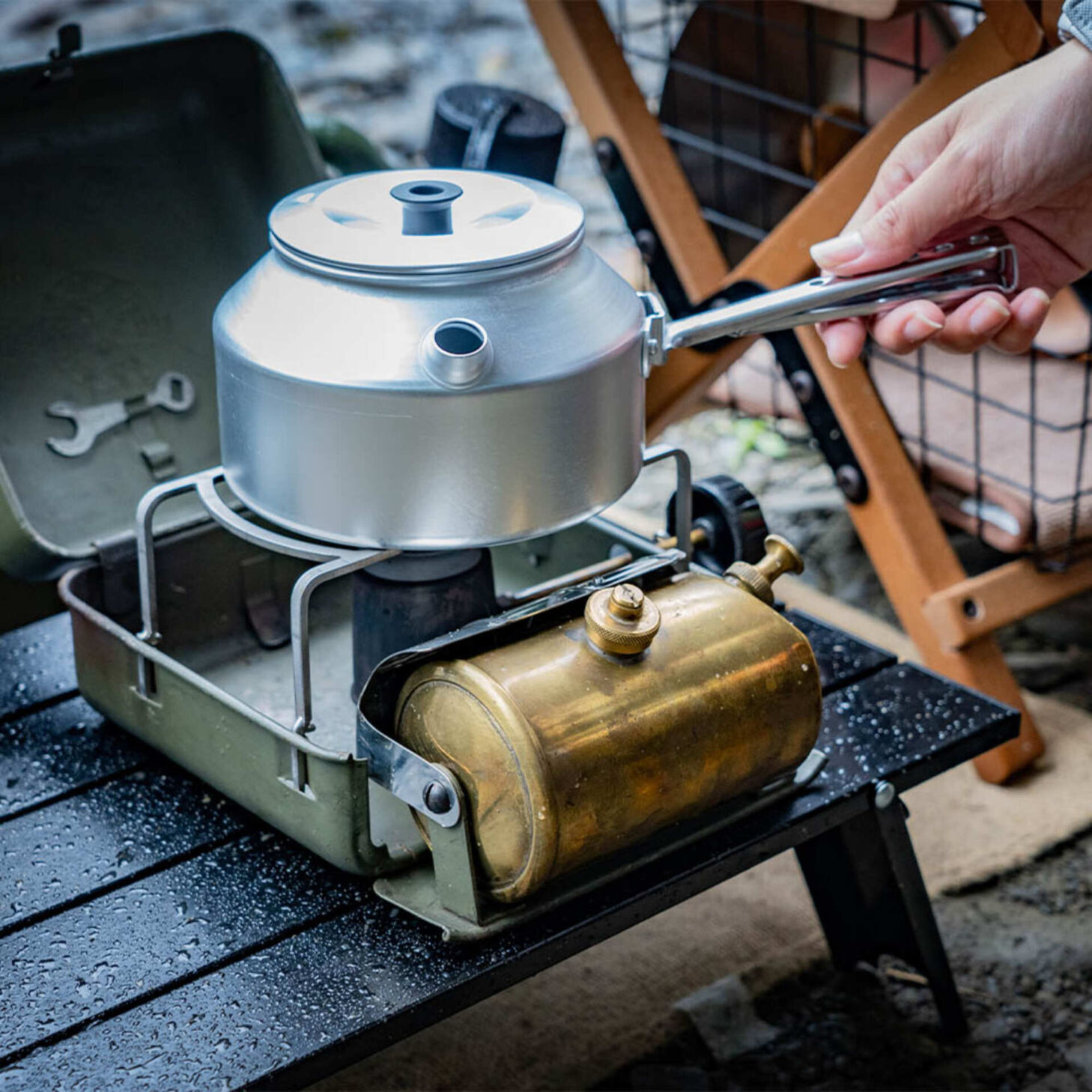กาต้มน้ำอลูมิเนียมขนาดใหญ่ พร้อมฝา รุ่นเตี้ย พร้อมที่จับลวดและที่จับพลาสติกแบบถอดได้ ใช้ได้กับเตา TRANGIA ขนาดใหญ่ 25 ทุกรุ่น รุ่นนี้มีลูกบิดสแตนเลส