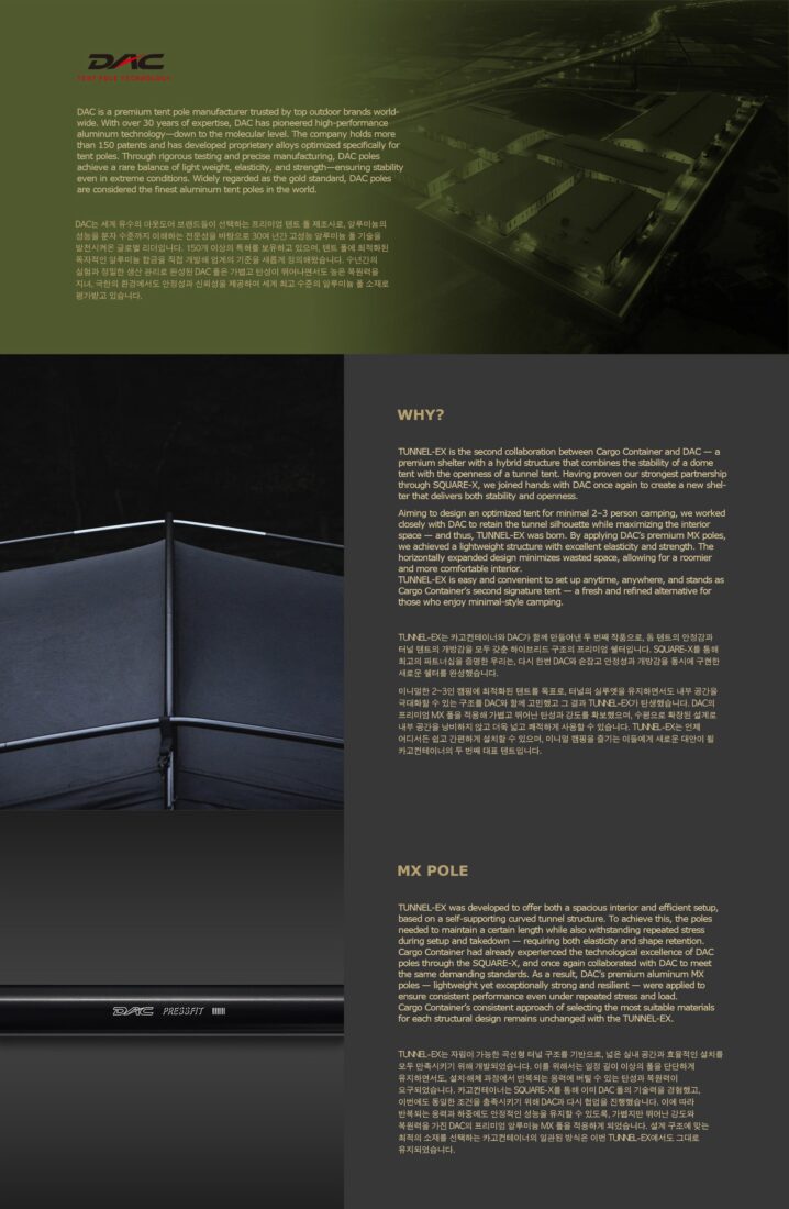 CC TUNNEL-EX คือนิยามใหม่ของเต็นท์ทรงอุโมงค์ที่ผสานความกว้างขวางเข้ากับความแข็งแกร่งอย่างลงตัว เป็นผลงานชิ้นเอกที่เกิดจากความร่วมมือระหว่าง Cargo Container และ DAC (ผู้ผลิตเสาเต็นท์อันดับ 1 ของโลก) ด้วยโครงสร้างแบบ Hybrid Tunnel-Dome ที่ใช้เสา DAC MX Pole เกรดพรีเมียม พร้อมเทคโนโลยี Reverse Combi (RC) ทำให้ได้โครงสร้างที่ “ตั้งอยู่ได้เอง” (Self-supporting) โดยไม่ต้องขึงเชือกตลอดเวลา แก้จุดอ่อนของเต็นท์อุโมงค์แบบเดิมๆ ภายในกว้างขวาง เพดานสูง เดินเข้าออกสะดวก ระบายอากาศได้ดีเยี่ยมรอบทิศทาง และใช้วัสดุผ้าเกรดดีที่สุดที่ทนทานต่อทุกสภาพอากาศ นี่คือ “ป้อมปราการเคลื่อนที่” สำหรับนักแคมป์ปิ้งที่มองหาที่สุดของความสบายและความมั่นคง