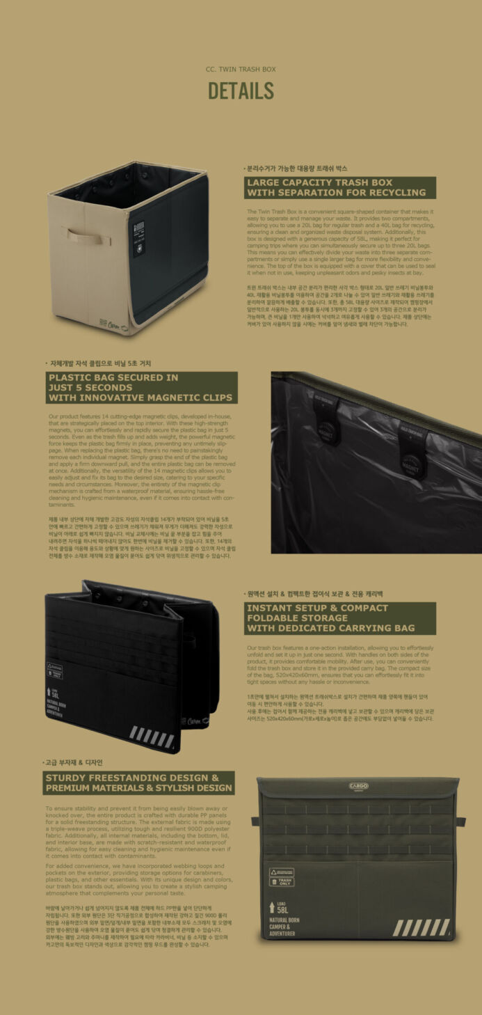 รายละเอียด : The Twin Trash Box เป็นกล่องทรงสี่เหลี่ยมที่ออกแบบมาเพื่อให้ง่ายต่อการแยกพื้นที่ภายใน โดยใช้คลิปแม่เหล็ก ช่วยให้คุณแบ่งพื้นที่ ออกเป็นสองช่องอย่างสะดวก โดยใช้ถุงขยะทั่วไปขนาด 20 ลิตร และถุงขนาด 40 ลิตร ช่วยให้คุณแยกขยะทั่วไปออกจากวัสดุที่รีไซเคิลได้ กล่องมีคลิปแม่เหล็กแรงสูง 14 ตัวที่ด้านบนด้านใน ช่วยให้คุณยึดถุงพลาสติกได้อย่างรวดเร็วและง่ายดาย และปรับขนาดได้ตามต้องการตามความต้องการและสถานการณ์ของคุณ