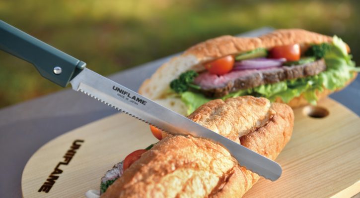 มีดหั่นขนมปัง จาก Uniflame ใบมีดแบบหยักขนาดใหญ่และเล็กสามารถหั่นขนมปังที่มีความมแข็งต่างกันได้ ตัวมีดพับเก็บได้ พกพาสะดวก